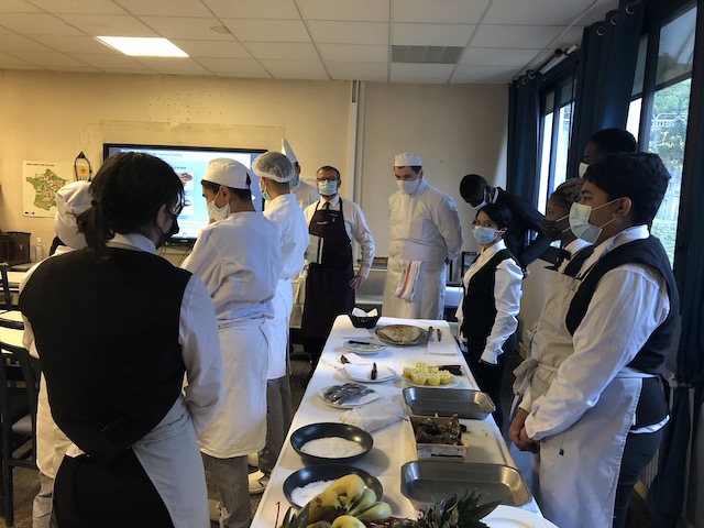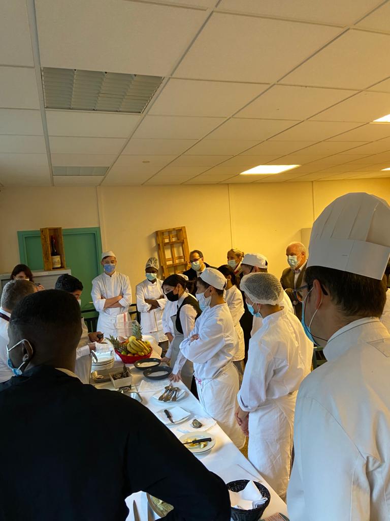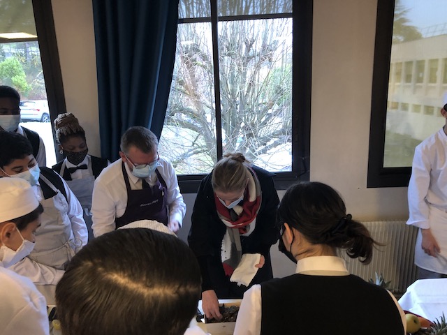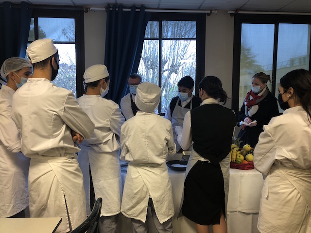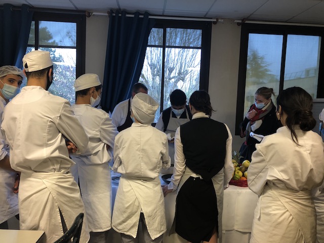 La séance de cours présentée en co-animation par Mr Dominique Bafcop professeur de commercialisation et service en restaurant et Mr Mazzoni professeur de cuisine autour des produits festifs a démontrée que les métiers du service et de la cuisine se distinguent par des compétences spécifiques très complémentaires.