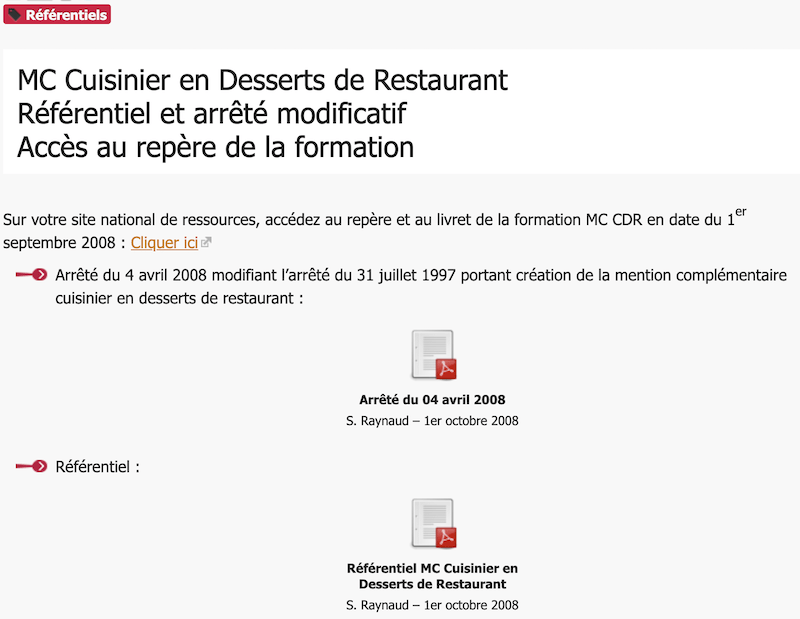 Référentiel MC Cuisinier en Desserts de Restaurant (Niveau III) Référentiel et arrêté modificatif :