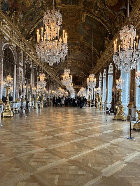 Aménagée au premier étage de l’aile du Midi, cette salle aux décors rehaussés d’or offre une vue sur les jardins de Versailles.